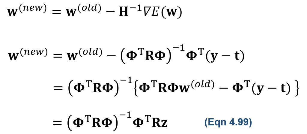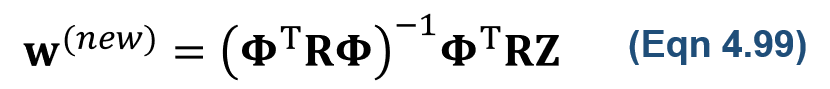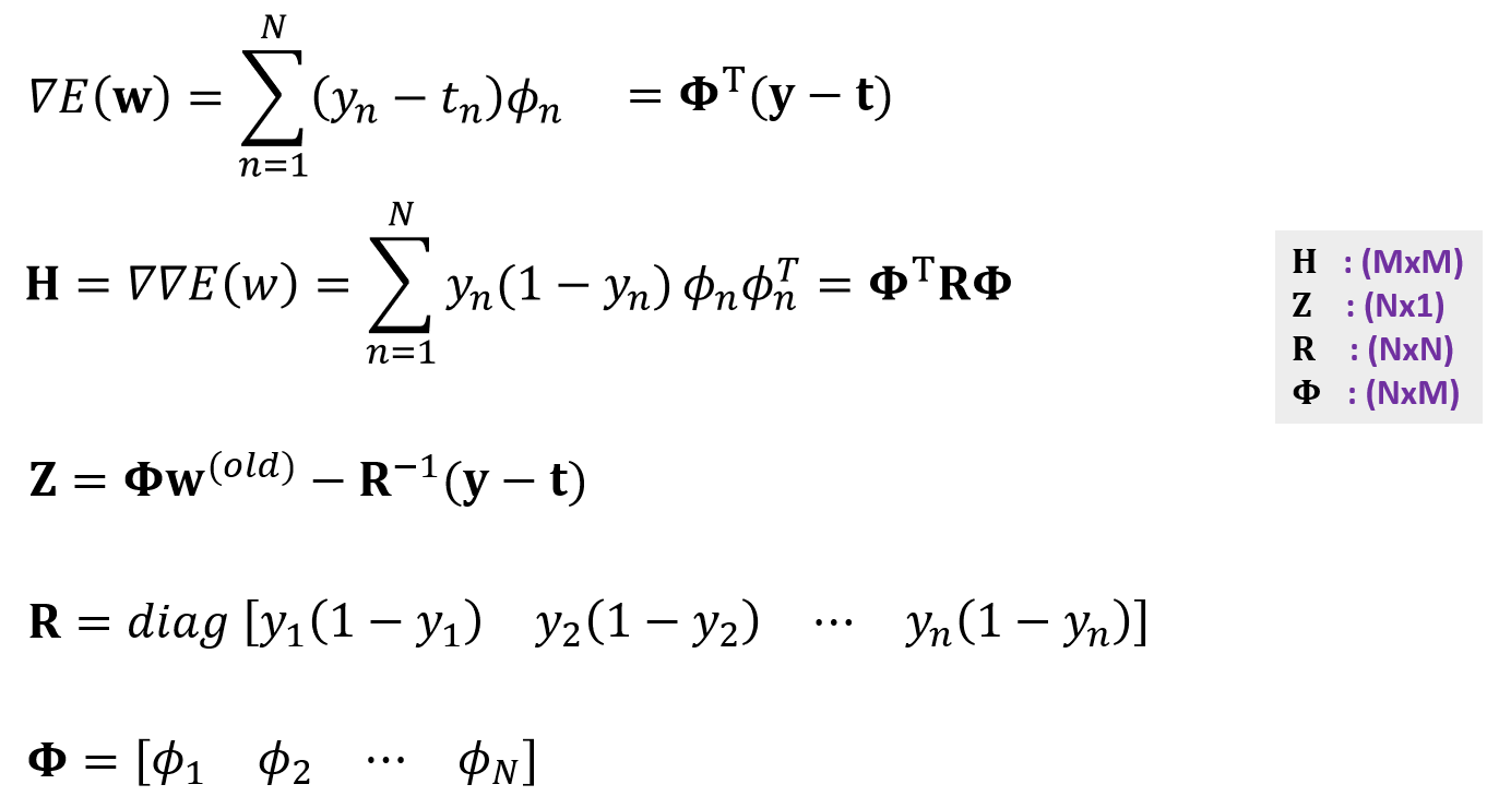 이러한 이유로 매번 w를 연산할 때마다 R 값을 계산하고, 계산된 R 값을 토대로 다시 w 에 대한 가중치를 둠으로써, 이러한 방법을 Iterative Reweighted Least Squares(IRLS) 라고 한다.