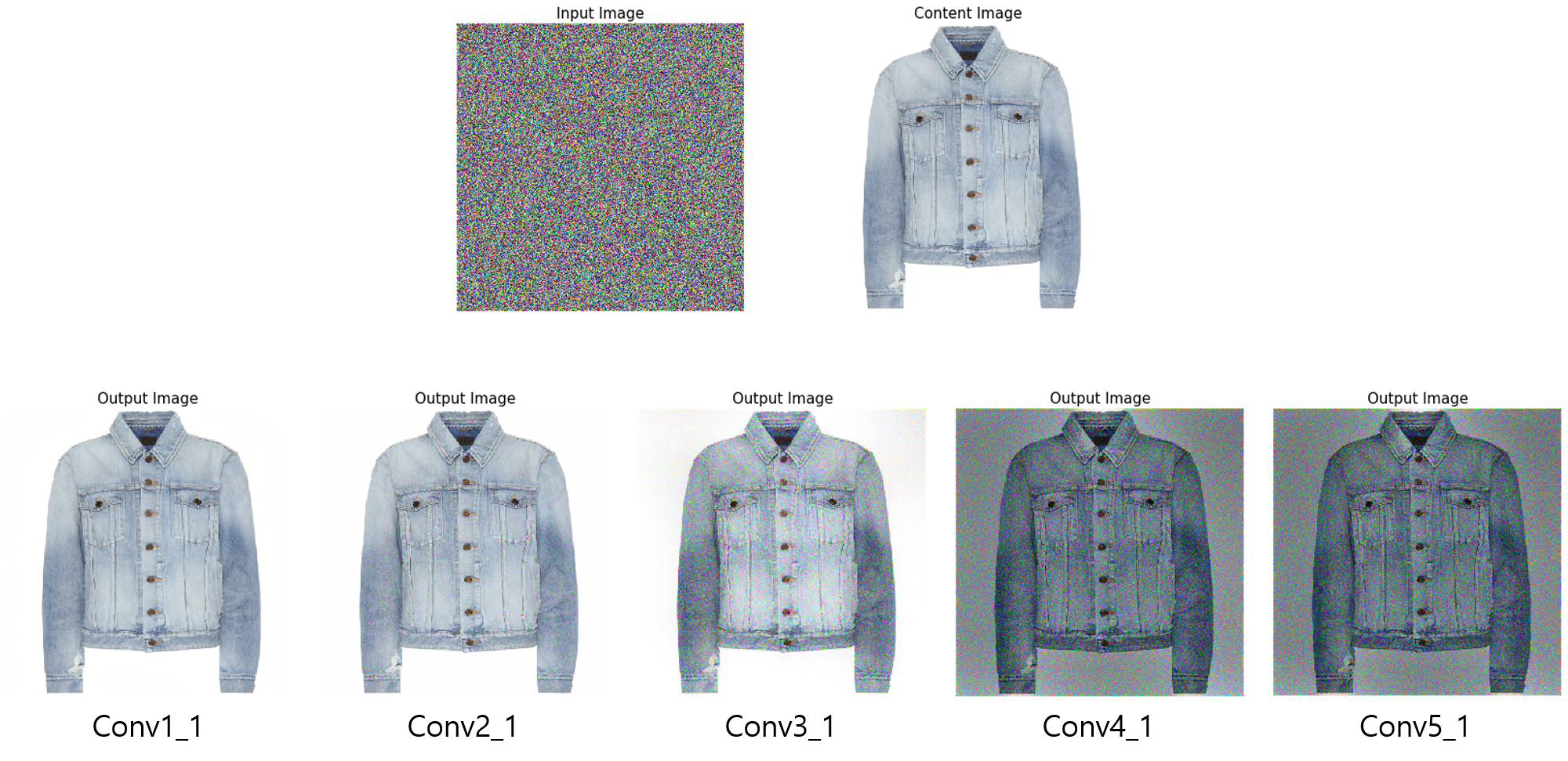 아래는 위의 Loss를 최소화하여 구한 각 레이어별 이미지이며, Loss가 단순히 픽셀간 비교이기 때문에 이미지에 큰 변화는 없다.